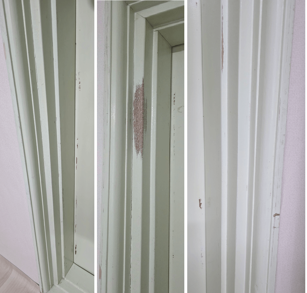 먼저 오래된 나무문의 상태를 살펴보겠습니다. 문틀도 그렇고 문도 그렇고 군데군데 칠이 벗겨진 부분이 많습니다. 그리고 색이 전체적으로 많이 바래져 있고 변색된 부분도 많습니다. 그래도 많이 파져 있는 부분은 없어서 퍼티 작업은 생략해도 충분할 것 같습니다. 젯소 작업 전 문을 한 번 꼼꼼하게 물걸레도 닦아주었습니다.