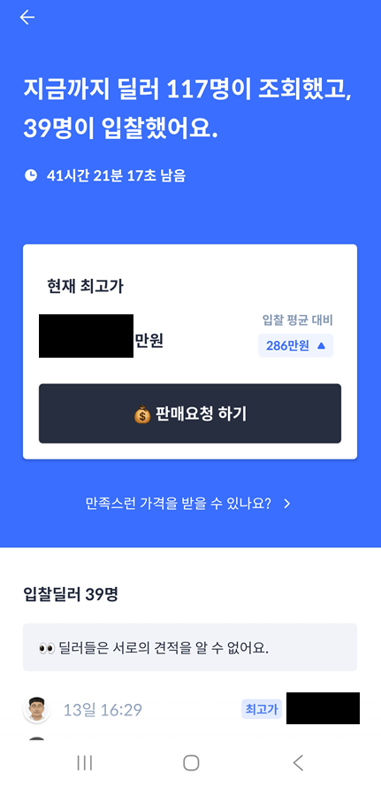 중간에도 만족스러운 가격이 나오면 판매요청 하기 가능하지만 그래도 끝까지 기다려 보시길 바랍니다. 저는 주말 포함해서 진행하였기에 3일 동안 경매가 진행 되었습니다. 가격은 예상시세에서 그나마 최고가와 같은 수치에 경매가 끝났습니다. 이제 차량을 팔려면 판매요청을 아니면 그냥 끝내시면 됩니다.