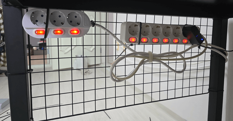 설치된 네트망에 먼저 멀티탭을 케이블 타이를 사용하여 고정시킵니다. 이때 케이블 타이가 멀티텝 공간을 너무 잡아먹지 않게 하기 위하여 최대한 얇은 폭을 가진 케이블 타이를 사용하시는 것이 유용합니다. 너무 지저분하지 않게 멀티탭의 전선도 정리해 줍니다. 나중에 다른 쪽으로 정리할 수도 있어서 우선은 벨크로를 이용하여 고정시켜 주었습니다.