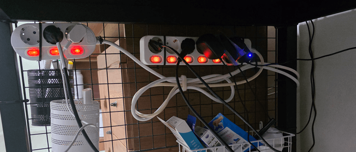 설치된 네트망에 먼저 멀티탭을 케이블 타이를 사용하여 고정시킵니다. 이때 케이블 타이가 멀티텝 공간을 너무 잡아먹지 않게 하기 위하여 최대한 얇은 폭을 가진 케이블 타이를 사용하시는 것이 유용합니다. 너무 지저분하지 않게 멀티탭의 전선도 정리해 줍니다. 나중에 다른 쪽으로 정리할 수도 있어서 우선은 벨크로를 이용하여 고정시켜 주었습니다.